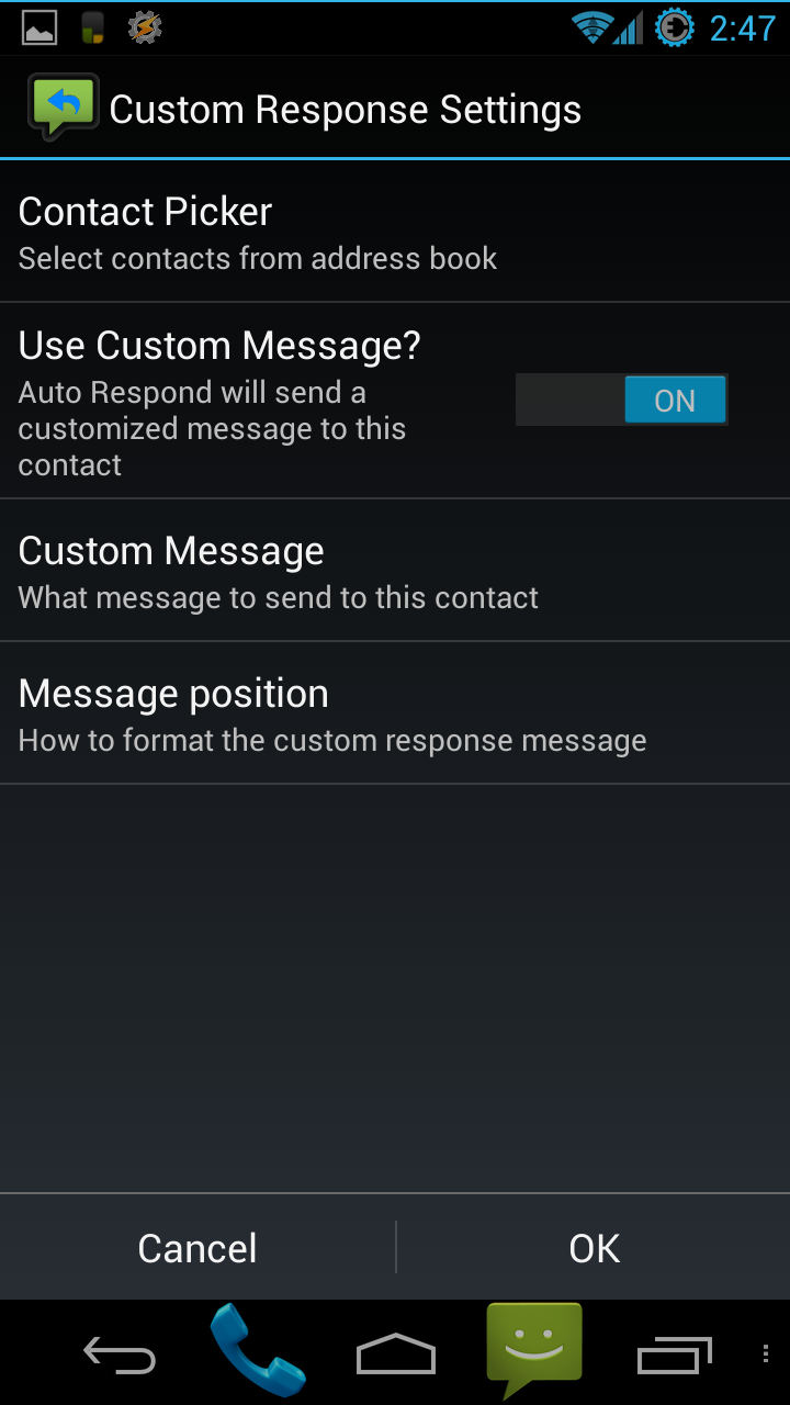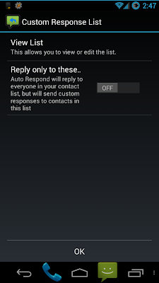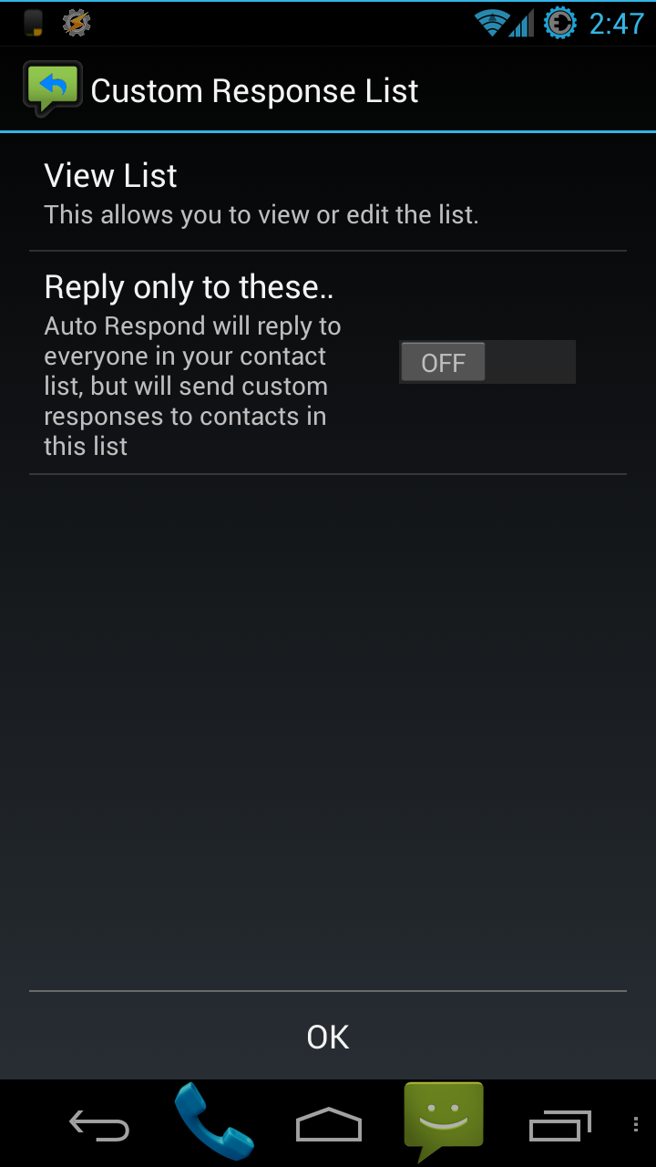 When you first go into the “Custom Response List” menu, you get 2 options: “View List”, and “Reply only to these contacts”